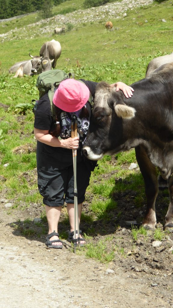 Bonuksena tietenkin lehmäkuva. Minut tunteva tietää senkin että lehmät ovat suuria rakkauksia elämässäni. Ne ymmärtävät ja jaksavat kuunnella. Ne tulevat tervehtimään ja ihmettelevät kulkijoita. Jokunen karvakorvalehmä löytyi tästäkin laaksosta, vaikka muut rodut olivat selvästi enemmistönä. Tirolin harmaat hurmaajat ovat ihmisläheisiä ja uteliaita. Pitää muistaa että lehmää ei lähestytä ihan noin vaan. Pitää lukea eläintä, aivan kuin mitä muuta tahansa. Jos eläin tekee aloitteen tuttavuudelle niin seurustelu voi alkaa ja ihan sen ehdoilla. Kuvan ihanuudella oli paljon asiaa kerrottavana ja taisi vierähtää useampi minuutti rapsutellessa.