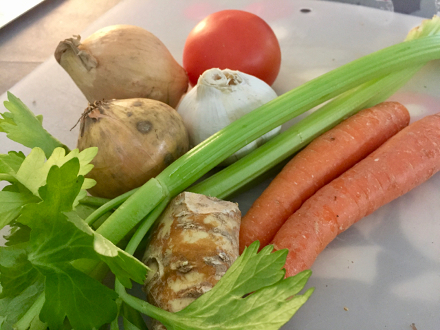 Keittopohja ja liha kylmään yön yli. Tai jos on aloittanut jo aamulla riittävän aikaisin niin seuraavaksi suoraan itse keiton valmistamiseen.