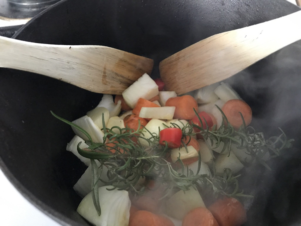 Öljyssä ja voissa ensin freesausta juureksille. Loput ainekset pataan.