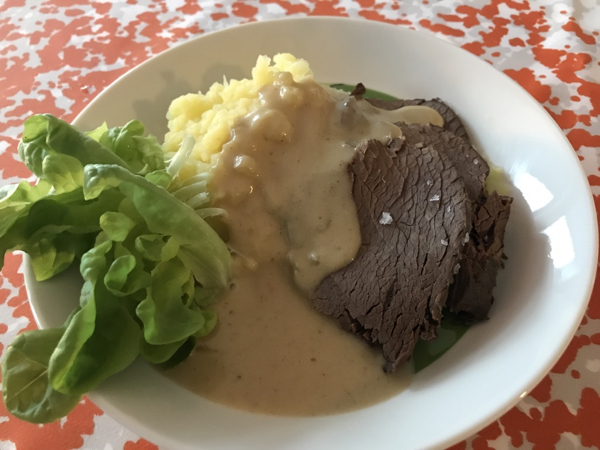 Kaveriksi syntyi juuresmuusia ja kastiketta. Kastike syntyi padan pohjalle kertyneestä nesteestä ja kermasta.