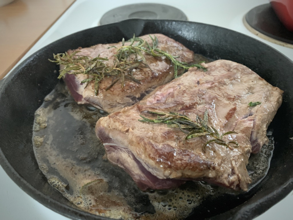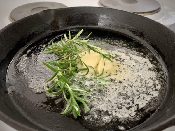 Valurautapannuun köntsä voita ja rosmariinin oksa makua antamaan. Kun pannu hiljeni niin fileen palat pannulle saamaan väriä ja paistamaan pinnat kiinni.