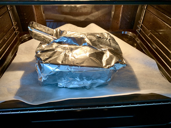 Vuoan peitin foliolla ja lisäsin paistomittarin. Folio pitää huolta nestekierrosta, jolloin erityistä välivalelua ei lihalle tarvitse tehdä.