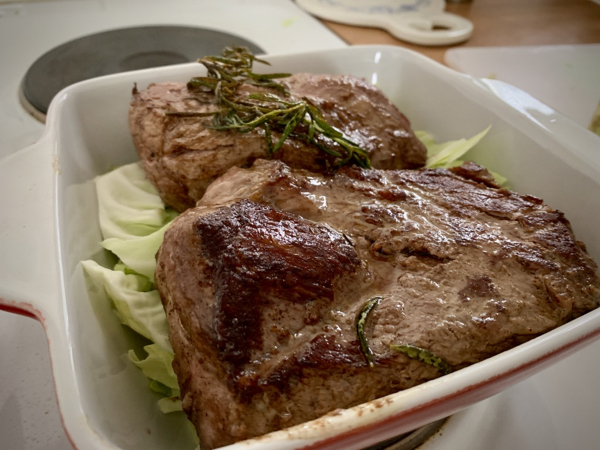 Paistamisen jälkeen liha vetäytyi peiton alla puolisen tuntia. Hyvä oli siivuttaa ohuiksi siivuiksi. Päälle vielä tuoretta rosmariinia ja sormisuolaa.