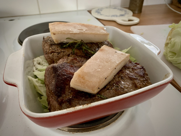 Pannuun lisäsin vielä paistoliemen ja 1 dl vettä sekä päällimmäiseksi silavapalat pitämään huolta siitä, että filee ei kuivu. Silava ei ehdi kokonaan sulaa uunissa, joten sillä voi sitten vaikka huoltaa pannut.
