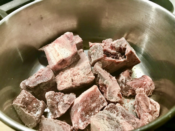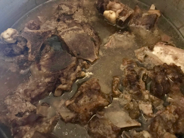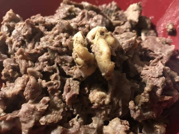 Annoin hieman jäähtyä ja riivin käsin luista lihat erikseen. Palautin luut kattilaan ja jatkoin vielä keittämistä.