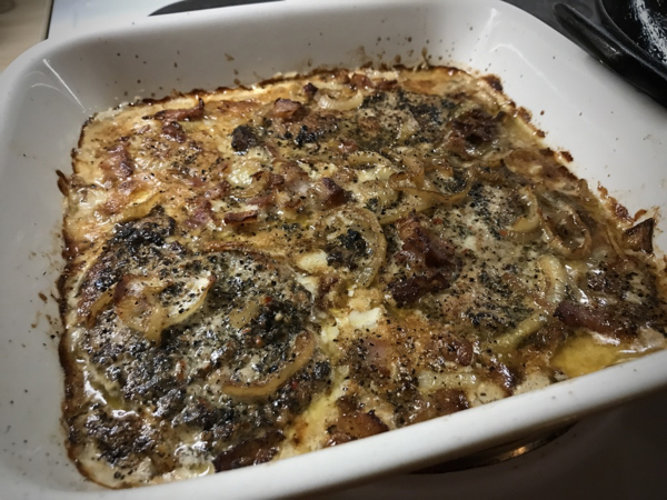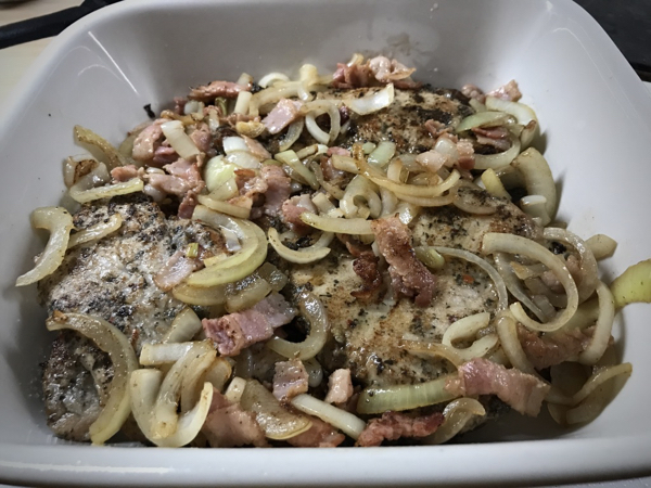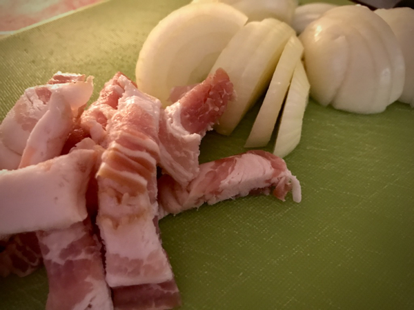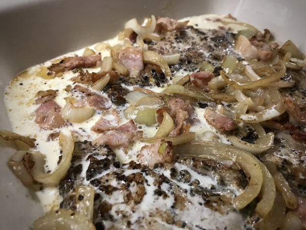 Kuullotin sipulin ja pekonin pannulla. Lisäsin tilkan vettä niin sain pannunpesuveden mukana aromit talteen.