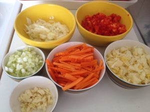 Ensin pilkoin pieneksi vihannes- ja juuresosaston tuotteet.