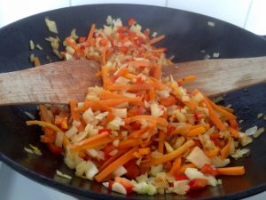 Wokkipannulla freesasin ensin sipulit ja lisäsin loput ainekset sekaan.