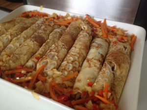 Kokoamisvaiheessa sivelin ensin puolikkaalle räiskäleelle hieman juoksevaa Koskenlaskijaa. Pari ruokalusikallista jauhelihaa ja kolme ruokalusikallista vihannesseosta. Koko komeus rullalle ja uuninkestävään vuokaan. Kaikkiaan sain yhdeksän kreppiä tehdyksi.