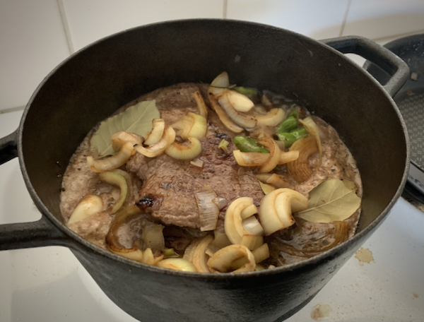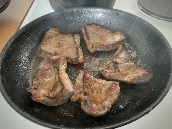 Alkuun paistoin voissa pihvien pinnat kiinni ja siirsin ne valurautapataan. Paistoin pannulla vielä sipulit ja lisäsin pataan.