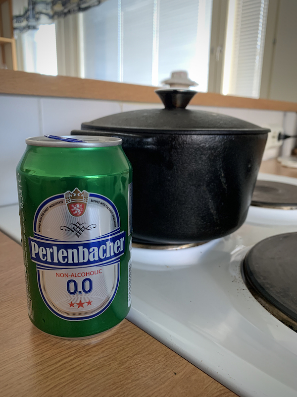 Liemeksi jääkaapin uumenista löydetty alkoholiton olut sekä sekaan lihalientä tai luulientä. Pataan meni vielä mausteeksi pari pientä porkkanaa maustamaan lientä.