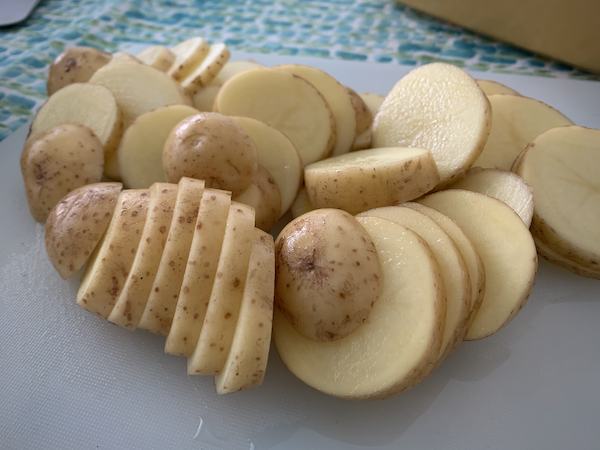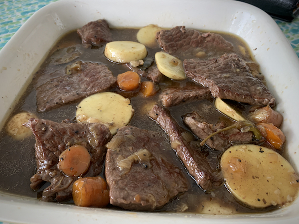 Pesin perunat hyvin ja siivutin kuorineen ohuiksi siivuiksi. Hautuneet lihat, sipulit ja perunat sekoitin padassa ja siirsin uunivuokaan loppukypsennystä varten.